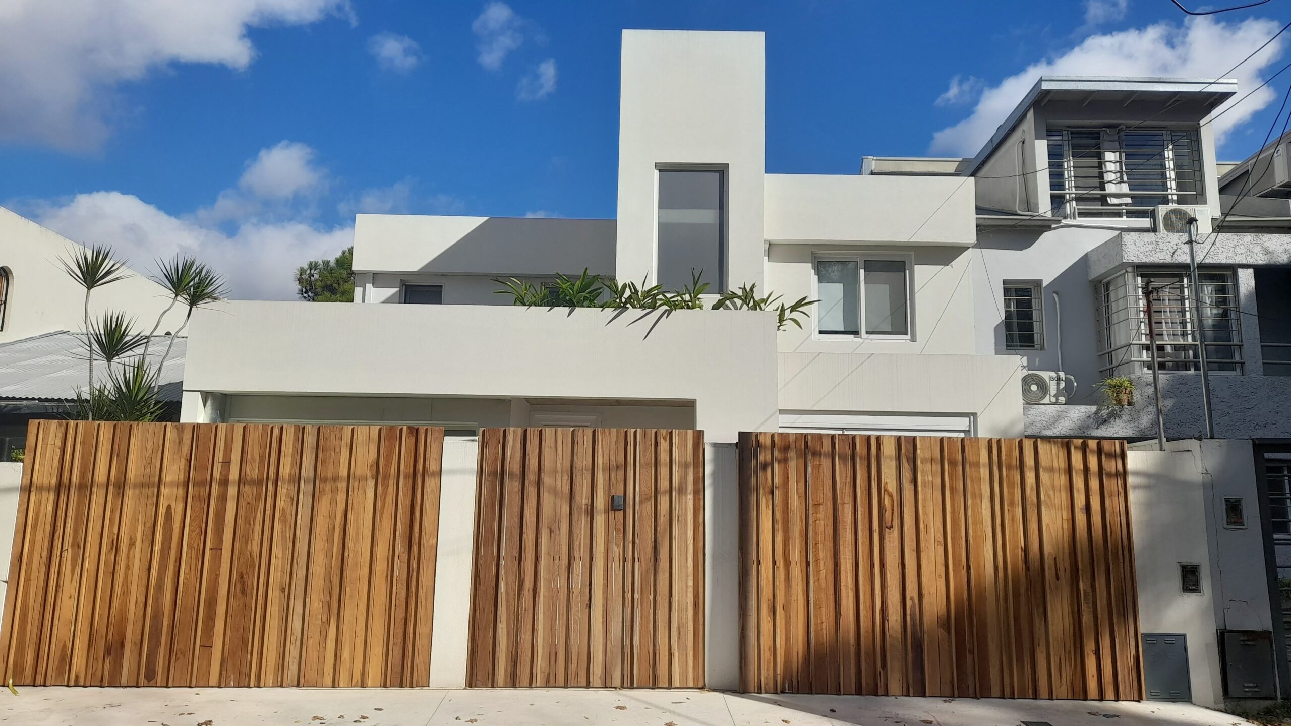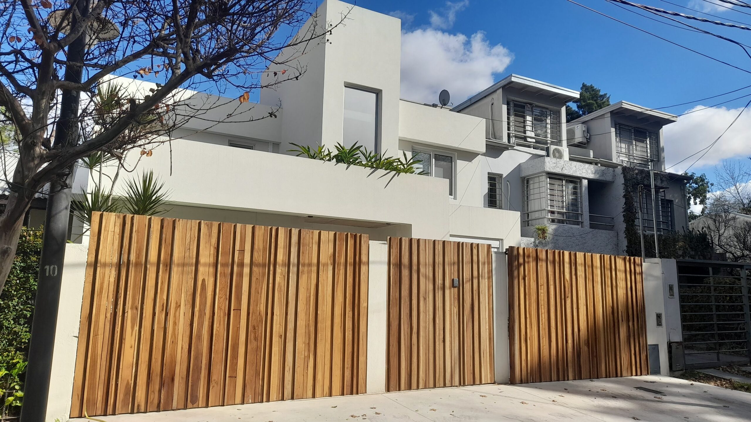 Sus detalles de madera en trama vertical, permiten equilibrar la calidez con lo austero, Siendo a su vez limites fisicos y de seguridad para la vivienda.